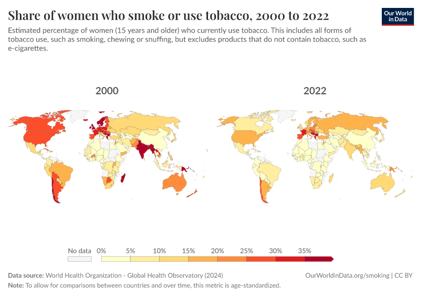 World Health Organization - Global Health Observatory (2024) – processed by Our World in Data. “Share of women who smoke or use tobacco” [dataset]. World Health Organization, “Global Health Observatory” [original data]. Retrieved March 3, 2026 from https://data-faostat-update-datasets.owid.pages.dev:8789/20260119-065148/grapher/share-of-women-who-are-smoking.html (archived on January 19, 2026).