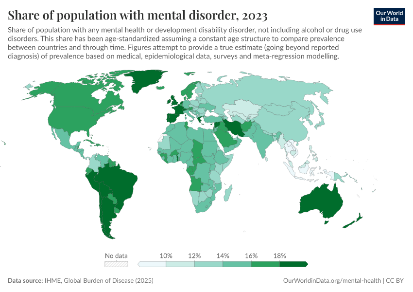IHME, Global Burden of Disease (2025) – with major processing by Our World in Data. “Share of population with mental disorder” [dataset]. IHME, Global Burden of Disease, “Global Burden of Disease - Mental Health Prevalence” [original data]. Retrieved March 3, 2026 from https://data-faostat-update-datasets.owid.pages.dev:8789/20260212-100858/grapher/share-with-mental-health-or-development-disorder.html (archived on February 12, 2026).
