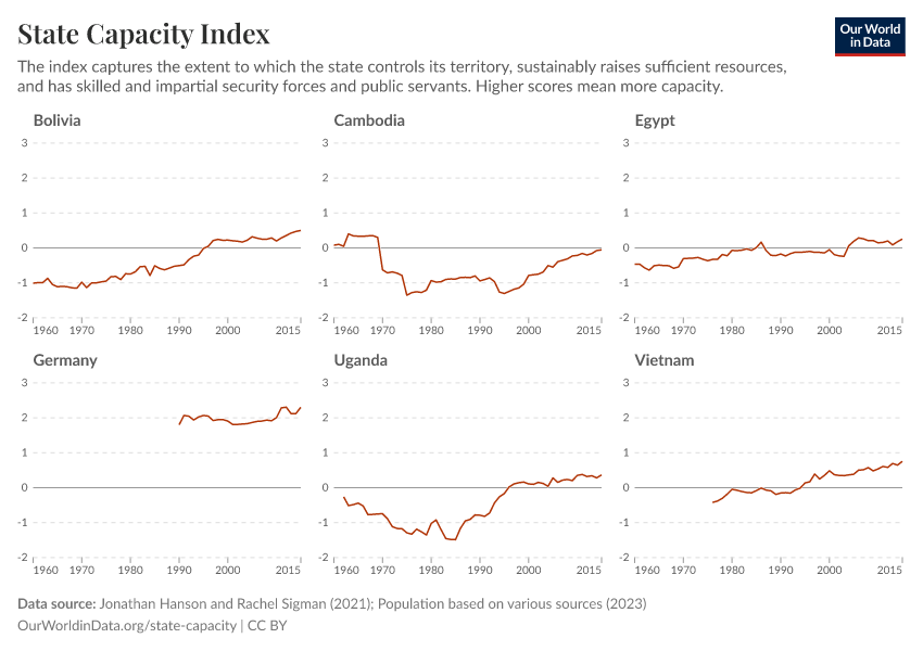 Measures state capacity by combining 21 different indicators related to three key dimensions: extractive capacity, coercive capacity, and administrative capacity. Higher values indicate greater state capacity.