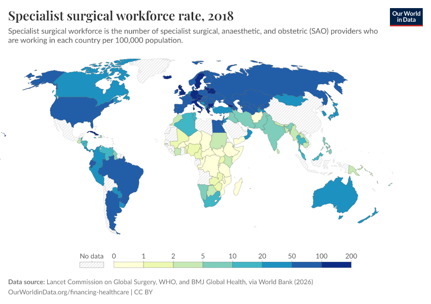 “Data Page: Specialist surgical workforce rate”. Our World in Data (2026). Data adapted from Lancet Commission on Global Surgery, WHO, and BMJ Global Health, via World Bank. Retrieved from https://data-faostat-update-datasets.owid.pages.dev:8789/20260301-083443/grapher/surgeons-per-100000.html [online resource] (archived on March 1, 2026).How to cite this data