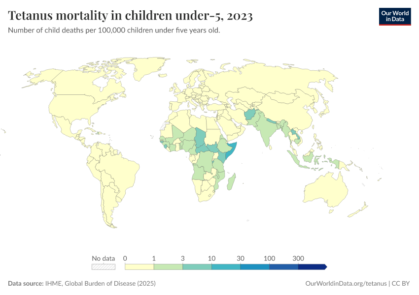“Data Page: Tetanus mortality in children under-5”, part of the following publication: Esteban Ortiz-Ospina and Max Roser (2016) - “Global Health”. Data adapted from IHME, Global Burden of Disease. Retrieved from https://data-faostat-update-datasets.owid.pages.dev:8789/20260211-174736/grapher/tetanus-mortality-in-children-under-5.html [online resource] (archived on February 11, 2026).How to cite this data