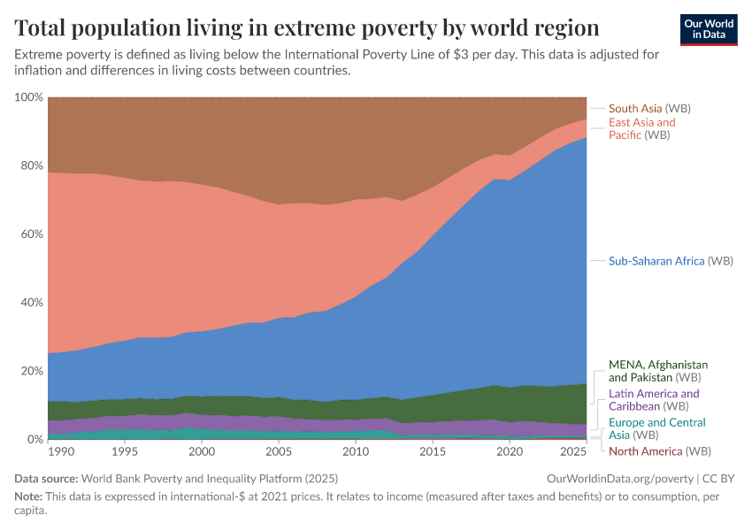 World Bank Poverty and Inequality Platform (2025) – with major processing by Our World in Data. “Total population living in extreme poverty by world region – World Bank” [dataset]. World Bank Poverty and Inequality Platform, “World Bank Poverty and Inequality Platform (PIP) 20250930_2021, 20250930_2017” [original data]. Retrieved March 3, 2026 from https://data-faostat-update-datasets.owid.pages.dev:8789/20260127-114142/grapher/total-population-living-in-extreme-poverty-by-world-region.html (archived on January 27, 2026).