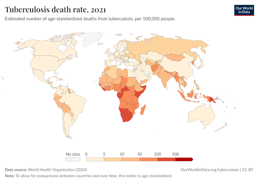 World Health Organization (2024) – with major processing by Our World in Data. “Tuberculosis death rate” [dataset]. World Health Organization, “Global Health Estimates” [original data]. Retrieved March 3, 2026 from https://data-faostat-update-datasets.owid.pages.dev:8789/20250909-093708/grapher/tuberculosis-death-rate-age-standardized.html (archived on September 9, 2025).
