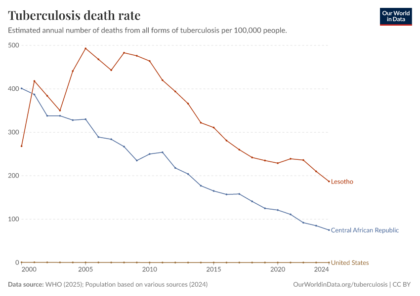 “Data Page: Tuberculosis death rate”, part of the following publication: Saloni Dattani, Fiona Spooner, Hannah Ritchie, and Max Roser (2023) - “Tuberculosis”. Data adapted from WHO, Various sources. Retrieved from https://data-faostat-update-datasets.owid.pages.dev:8789/20260205-170810/grapher/tuberculosis-death-rate.html [online resource] (archived on February 5, 2026).How to cite this data