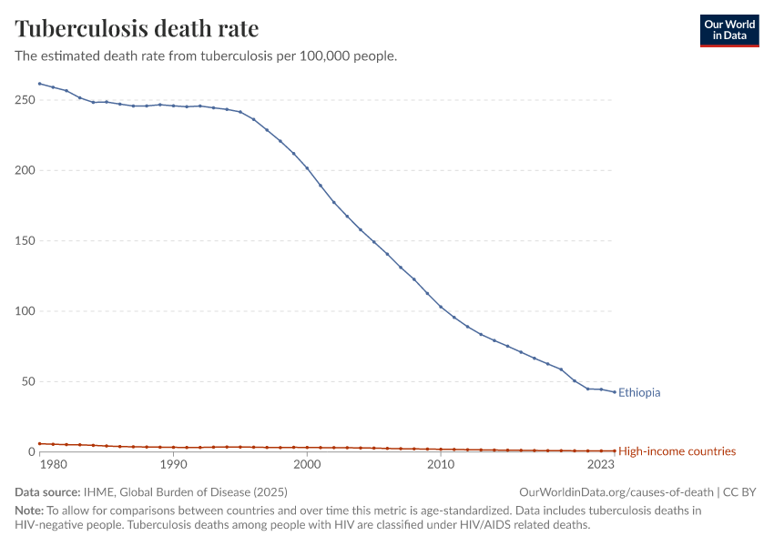 IHME, Global Burden of Disease (2025) – with major processing by Our World in Data. “Tuberculosis death rate” [dataset]. IHME, Global Burden of Disease, “Global Burden of Disease - Deaths” [original data]. Retrieved March 3, 2026 from https://data-faostat-update-datasets.owid.pages.dev:8789/20260211-174736/grapher/tuberculosis-death-rates.html (archived on February 11, 2026).