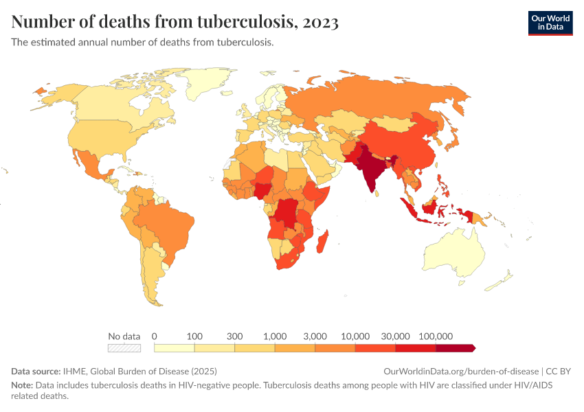 “Data Page: Number of deaths from tuberculosis”, part of the following publication: Esteban Ortiz-Ospina and Max Roser (2016) - “Global Health”. Data adapted from IHME, Global Burden of Disease. Retrieved from https://data-faostat-update-datasets.owid.pages.dev:8789/20260211-174736/grapher/tuberculosis-deaths.html [online resource] (archived on February 11, 2026).How to cite this data