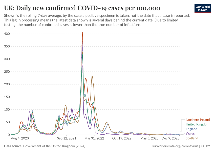Government of the United Kingdom (2024) – with minor processing by Our World in Data. “UK: Daily new confirmed COVID-19 cases per 100,000” [dataset]. Government of the United Kingdom, “UKHSA data dashboard” [original data]. Retrieved March 3, 2026 from https://data-faostat-update-datasets.owid.pages.dev:8789/20250909-093708/grapher/uk-daily-covid-cases-7day-average.html (archived on September 9, 2025).
