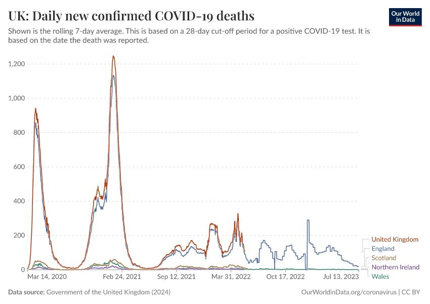 Government of the United Kingdom (2024) – with minor processing by Our World in Data. “UK: Daily new confirmed COVID-19 deaths” [dataset]. Government of the United Kingdom, “UKHSA data dashboard” [original data]. Retrieved March 3, 2026 from https://data-faostat-update-datasets.owid.pages.dev:8789/20250909-093708/grapher/uk-daily-covid-deaths.html (archived on September 9, 2025).