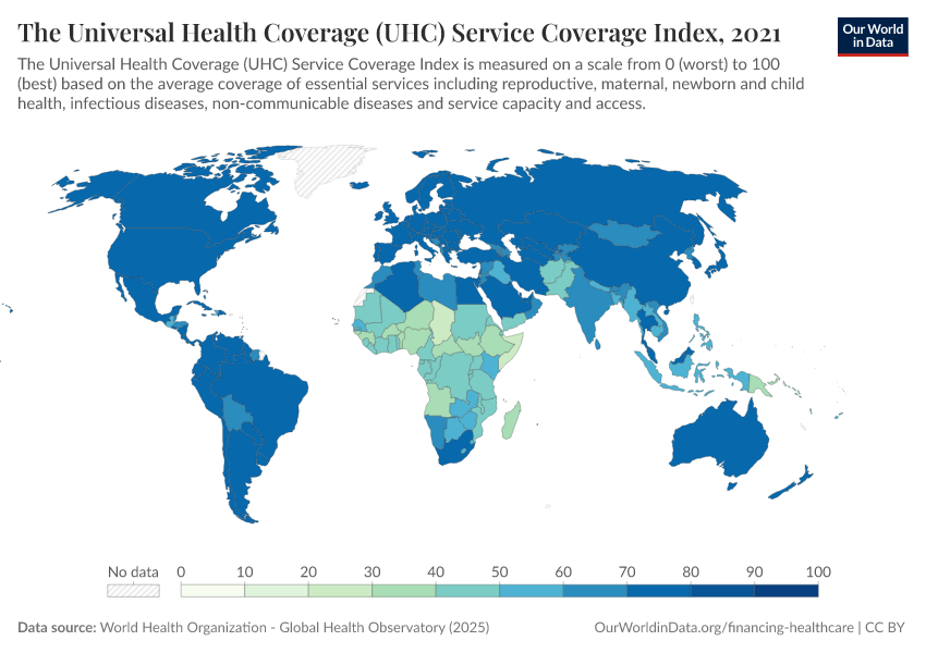 World Health Organization - Global Health Observatory (2025) – processed by Our World in Data. “The Universal Health Coverage (UHC) Service Coverage Index” [dataset]. World Health Organization, “Global Health Observatory” [original data]. Retrieved March 3, 2026 from https://data-faostat-update-datasets.owid.pages.dev:8789/20260119-070102/grapher/universal-health-coverage-index.html (archived on January 19, 2026).