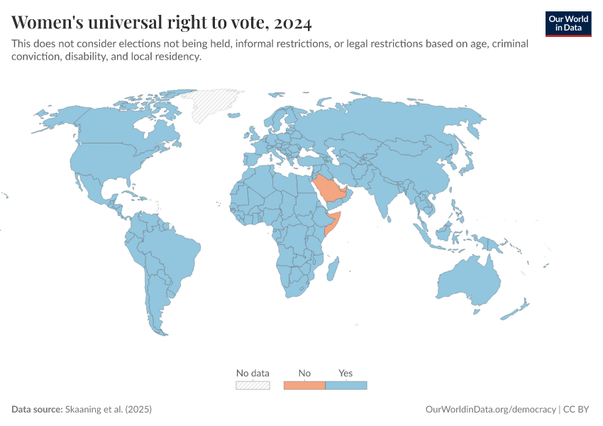 Skaaning et al. (2025) – processed by Our World in Data. “Women's universal right to vote” [dataset]. Skaaning et al., “Lexical Index of Electoral Democracy (LIED) v6.8” [original data]. Retrieved March 3, 2026 from https://data-faostat-update-datasets.owid.pages.dev:8789/20260119-065148/grapher/universal-suffrage-women-lexical.html (archived on January 19, 2026).