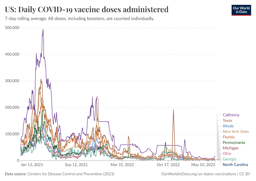 Centers for Disease Control and Prevention (2023) – processed by Our World in Data. “US: Daily COVID-19 vaccine doses administered” [dataset]. Centers for Disease Control and Prevention, “COVID-19, Vaccinations (United States)” [original data]. Retrieved March 3, 2026 from https://data-faostat-update-datasets.owid.pages.dev:8789/20250909-093708/grapher/us-daily-covid-vaccine-doses-administered.html (archived on September 9, 2025).