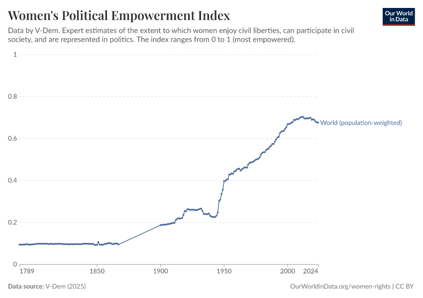“Data Page: Women's political empowerment index”, part of the following publication: Bastian Herre, Lucas Rodés-Guirao, and Esteban Ortiz-Ospina (2013) - “Democracy”. Data adapted from V-Dem. Retrieved from https://data-faostat-update-datasets.owid.pages.dev:8789/20260119-070102/grapher/women-political-empowerment-index.html [online resource] (archived on January 19, 2026).How to cite this data