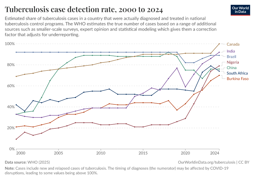 In the chart below, you can see rises in detection rates for tuberculosis in different countries. This is again helped by efforts such as The Global Fund and PEPFAR.