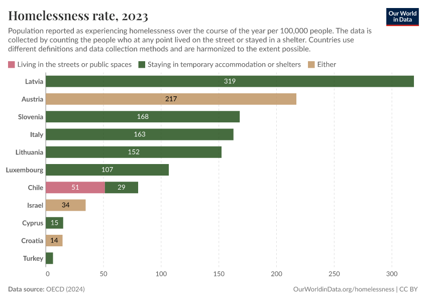 On this page, you can find data and visualizations on the number of people affected by homelessness across different countries and how these numbers have changed over time. When presenting this data, we’ve been careful to clarify where comparisons can and can’t be made directly due to differences in definitions and methods.