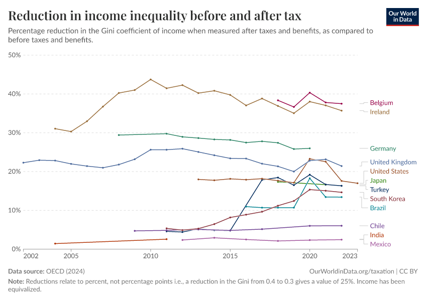 Joe Hasell (2023) - “Income inequality before and after taxes: how much do countries redistribute income?” Published online at OurWorldinData.org. Retrieved from: 'https://data-faostat-update-datasets.owid.pages.dev:8789/20260119-065148/income-inequality-before-and-after-taxes.html' [Online Resource] (archived on January 19, 2026).BibTeX citation