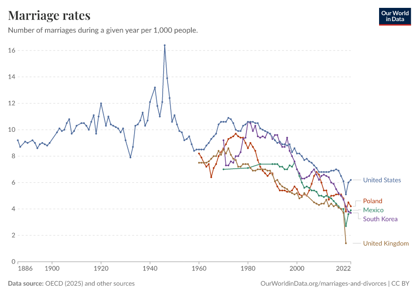 The chart also shows that in comparison to other rich countries, the US has had particularly high historical marriage rates. But in recent decades, marriage rates have decreased in almost all countries.