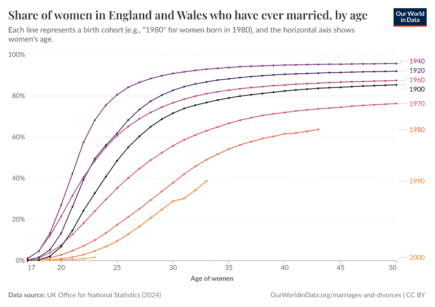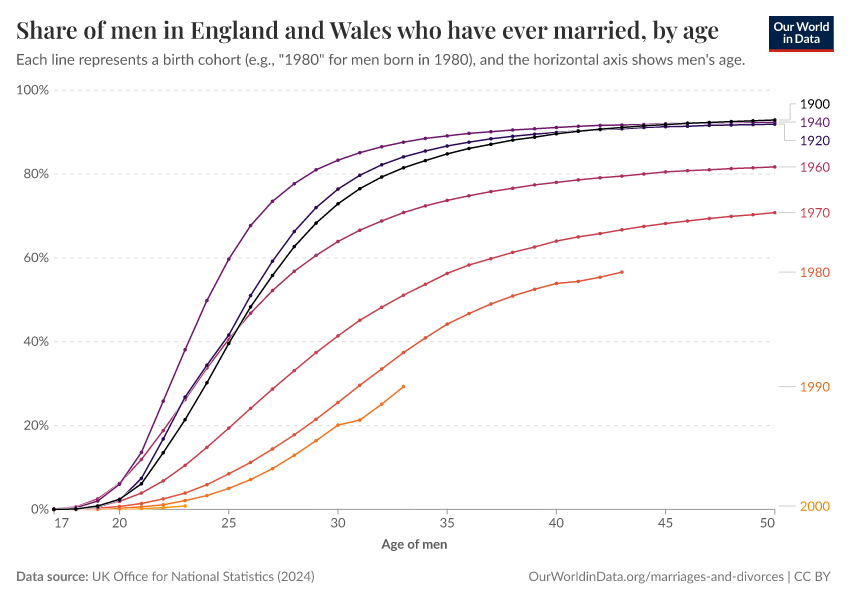 Some countries have statistical records going back several generations, which allow us to estimate marriage rates by age and year of birth. The charts here show this data for women and men born in England and Wales as early as 1900.