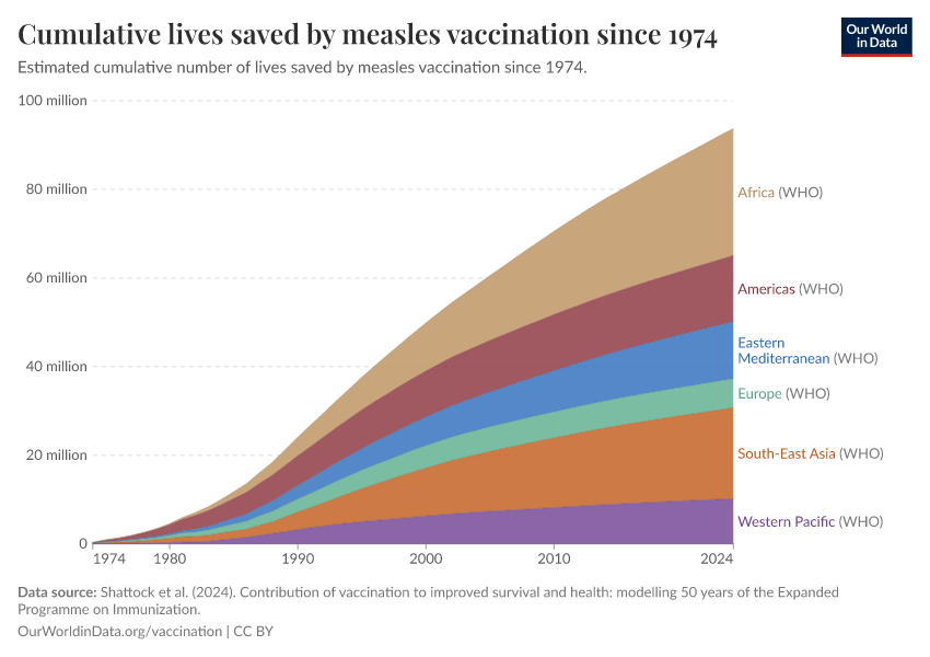 The impact has been greatest in Africa, with 29 million lives saved, and Southeast Asia, with 20 million lives saved. These are regions where measles was a leading cause of death in children until recently.