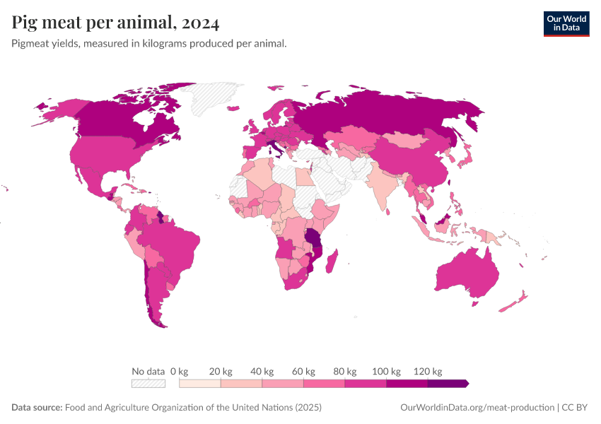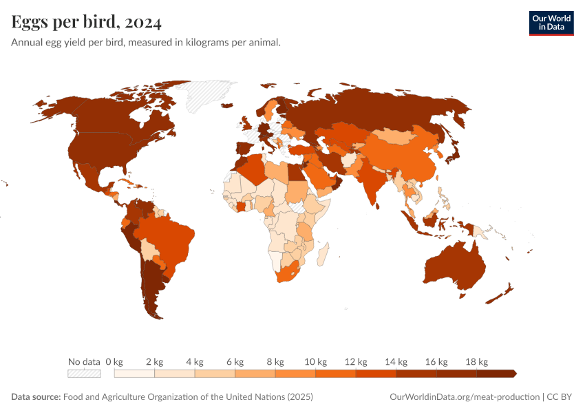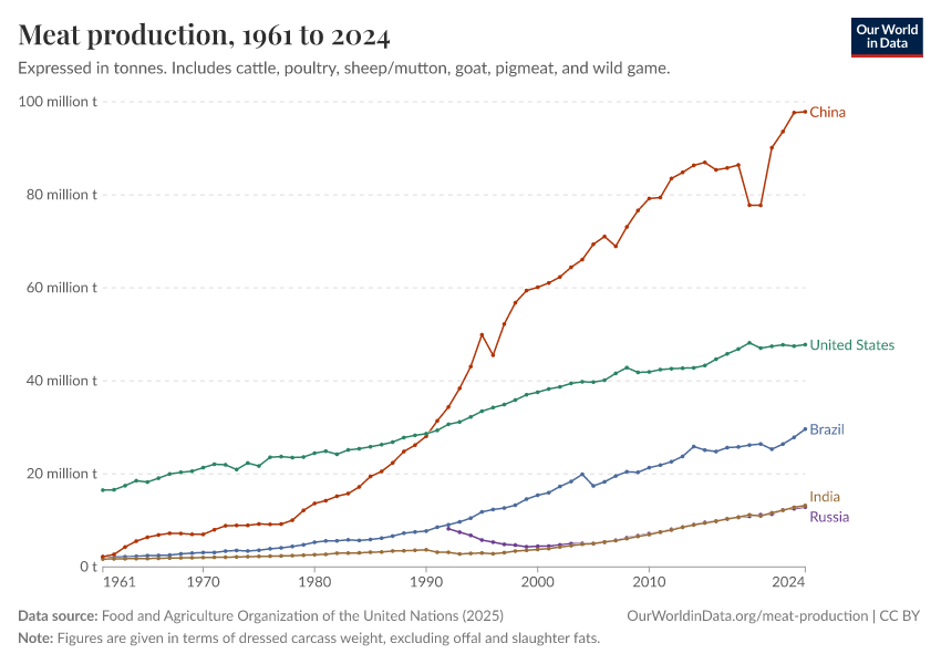 Hannah Ritchie, Pablo Rosado, and Max Roser (2019) - “Meat and Dairy Production” Published online at OurWorldinData.org. Retrieved from: 'https://data-faostat-update-datasets.owid.pages.dev/meat-production' [Online Resource]BibTeX citation