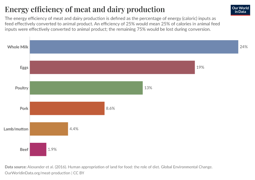 Protein and energy efficiency are calculated as the quantity of protein/energy in animal feed which is effectively converted into protein/energy in the resultant animal products. For example, if we feed a chicken 500 grams of protein and only get 100 grams out in chicken meat, we define this protein conversion efficiency as 20 percent (calculated as output (100 grams) / input (500 grams)). The same calculation process applies to energy conversion efficiency using caloric inputs and outputs.