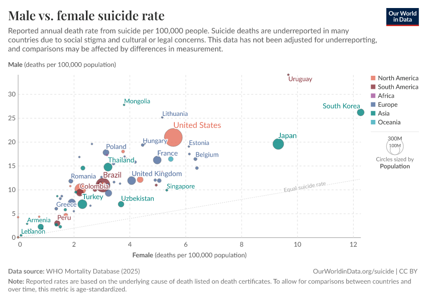 Saloni Dattani, Lucas Rodés-Guirao, Hannah Ritchie, Max Roser, and Esteban Ortiz-Ospina (2023) - “Suicides” Published online at OurWorldinData.org. Retrieved from: 'https://data-faostat-update-datasets.owid.pages.dev/suicide' [Online Resource]BibTeX citation