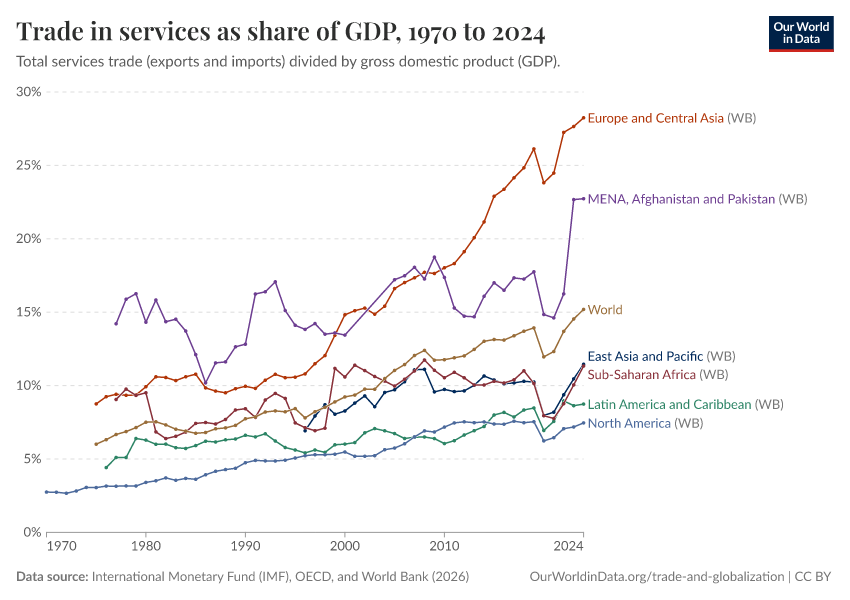 Globally, trade in goods accounts for the majority of trade transactions. But as this chart shows, the share of services in total global exports has been increasing in recent decades.