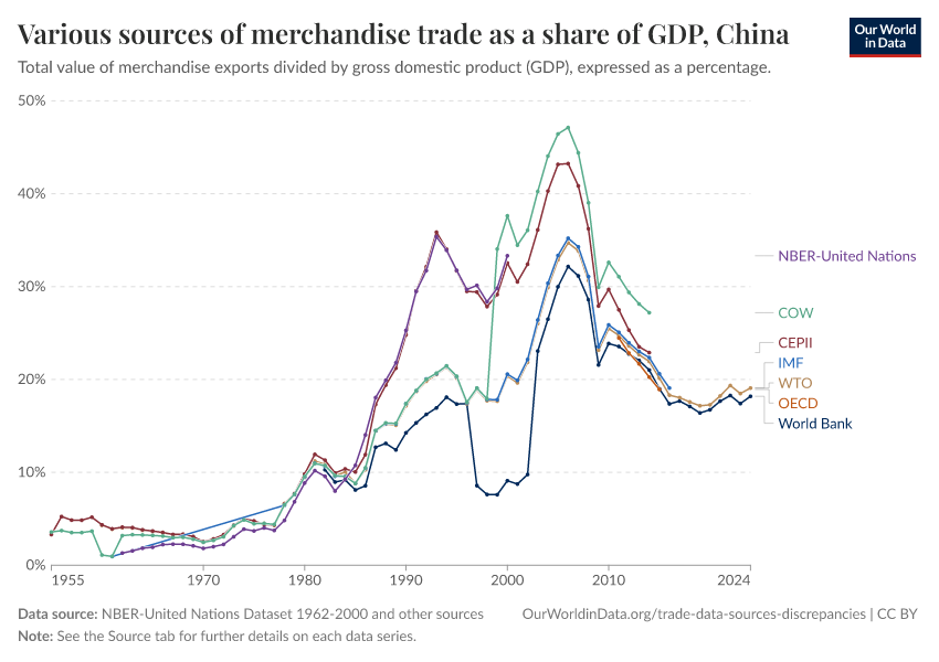 At Our World in Data, we have chosen to rely on CEPII as the main source for exploring long-run changes in international trade, but we also rely on World Bank, OECD, and IMF data for up-to-date cross-country comparisons.