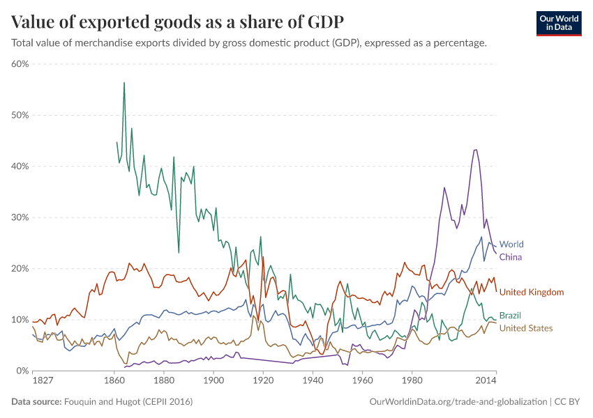 One of the key additions to the topic page are new charts exploring long-run trade estimates across countries and world regions. Here is an example: merchandise export-to-GDP ratios from 1827 up until 2014.