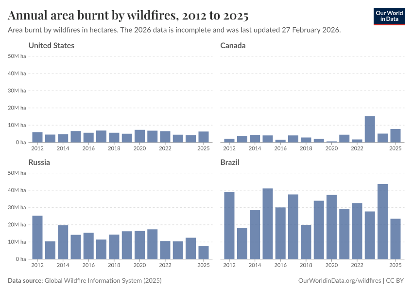 Veronika Samborska and Hannah Ritchie (2024) - “Wildfires” Published online at OurWorldinData.org. Retrieved from: 'https://data-faostat-update-datasets.owid.pages.dev/wildfires' [Online Resource]BibTeX citation