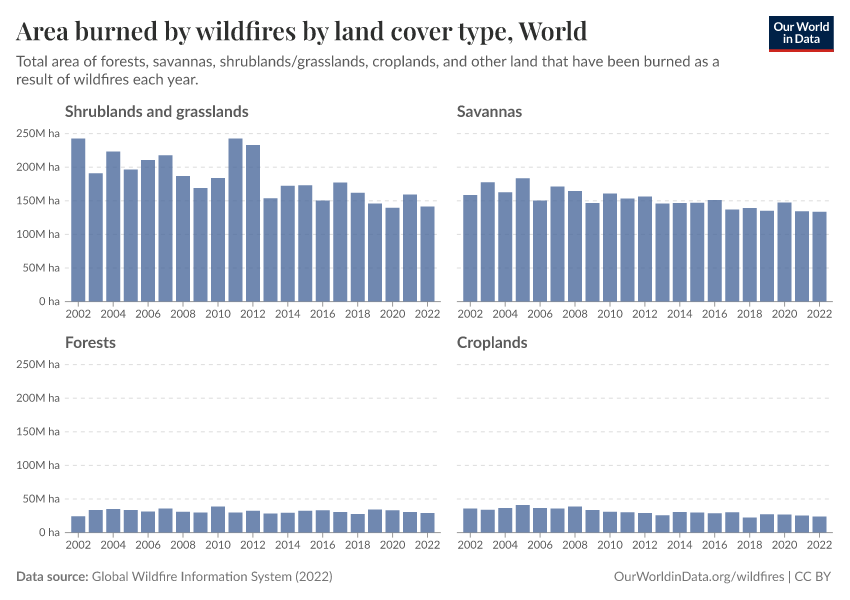 This can vary a lot depending on a country’s landscape. Savannas, for example, are much more dominant in Africa and South America America. In Oceania, it’s shrubs and grasslands. In Europe and North America, large areas of croplands are often burned.