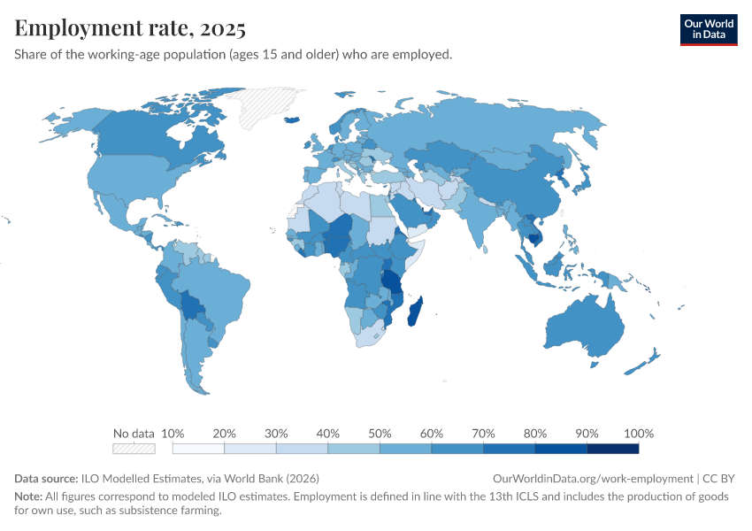 The exact definition of employment follows international standards that are set by the International Conference of Labour Statisticians (ICLS), and which have changed over time. We explain this further in How do international standards make labor data comparable?