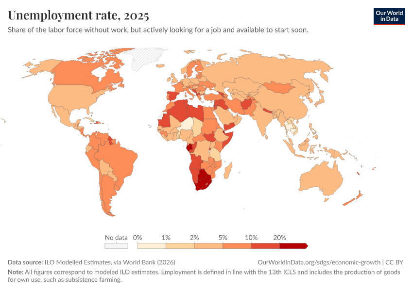 The next map plots unemployment rates across the world. The data shows that in recent years, most countries have had unemployment rates in the range of around 2% to 10%. This pattern holds for countries of very different income levels.